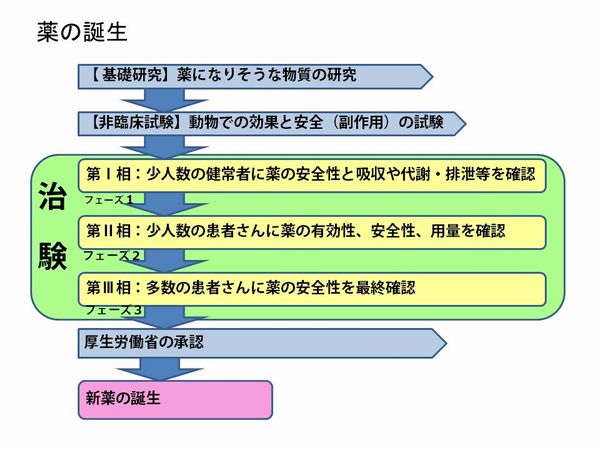 治験の結果をもとに国(厚生労働省)の承認が得られると、新薬を必要とする多くの患者さんに使用できるようになります。