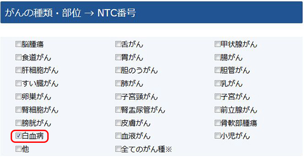 ①.「がんの部位(病名)」にチェックを入れます。(例:白血病にチェック)