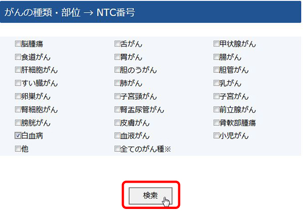 ②.「がんの部位(病名)」にチェックを入れたら「検索」をクリック。